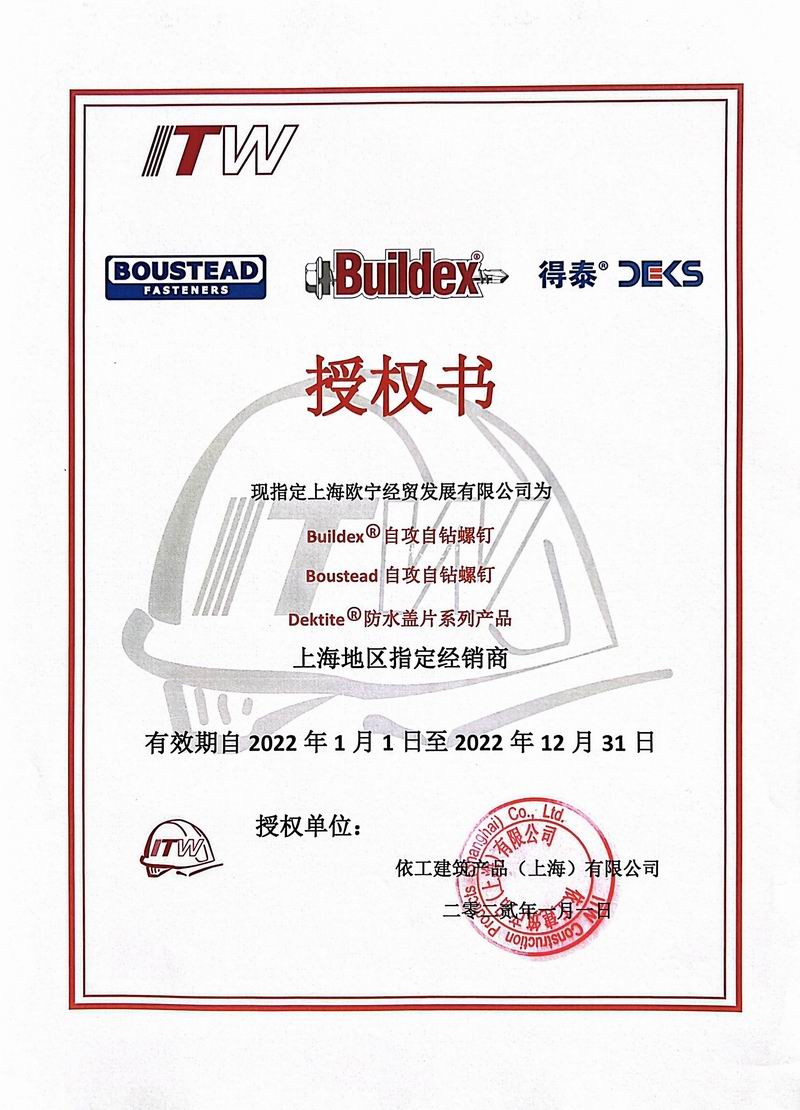 上海欧宁经贸发展有限公司是专业从事轻钢结构、建筑结构、建筑配件的销售服务部门,主要产品有:澳大利亚Buildex(标的)螺钉,澳大利亚Dektite(德泰)防水盖片,Myunghwa(明和)涂层螺钉、镀锌螺钉,陶熙钢结构用中性硅胶,之江硅胶,西卡聚氨酯密封胶,丁基橡胶密封胶条等各类轻钢辅助材料。